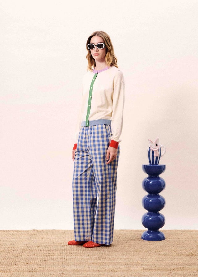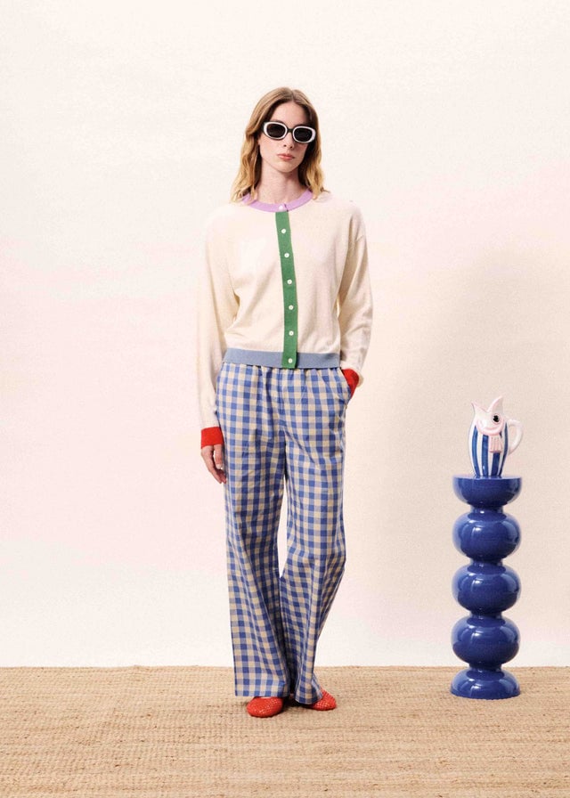 Cárdigan de punto con detalles en bloques de color y cierre de botones central.