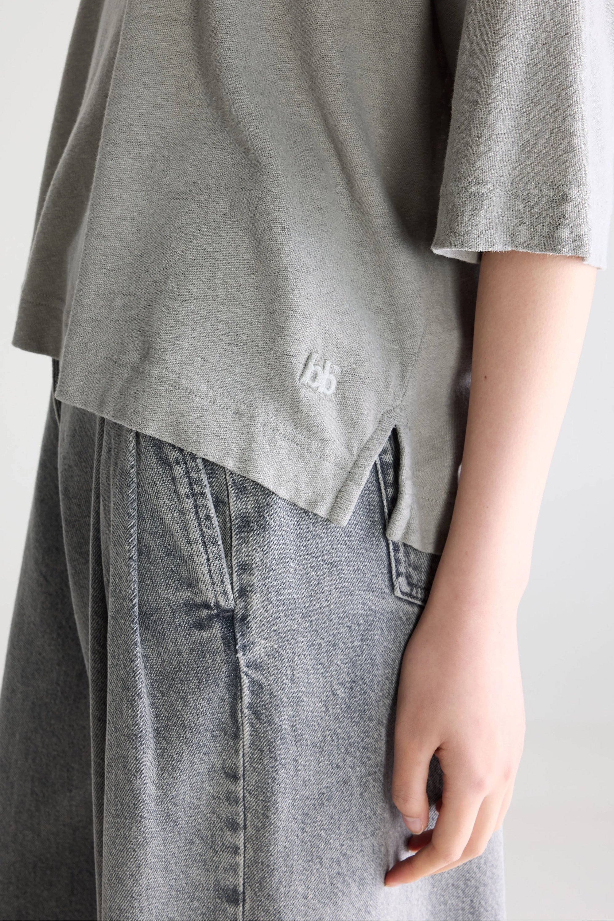 Camiseta manga corta, aberturas laterales, cuello redondo ligeramente abierto. 50% algodon y 50% lino.