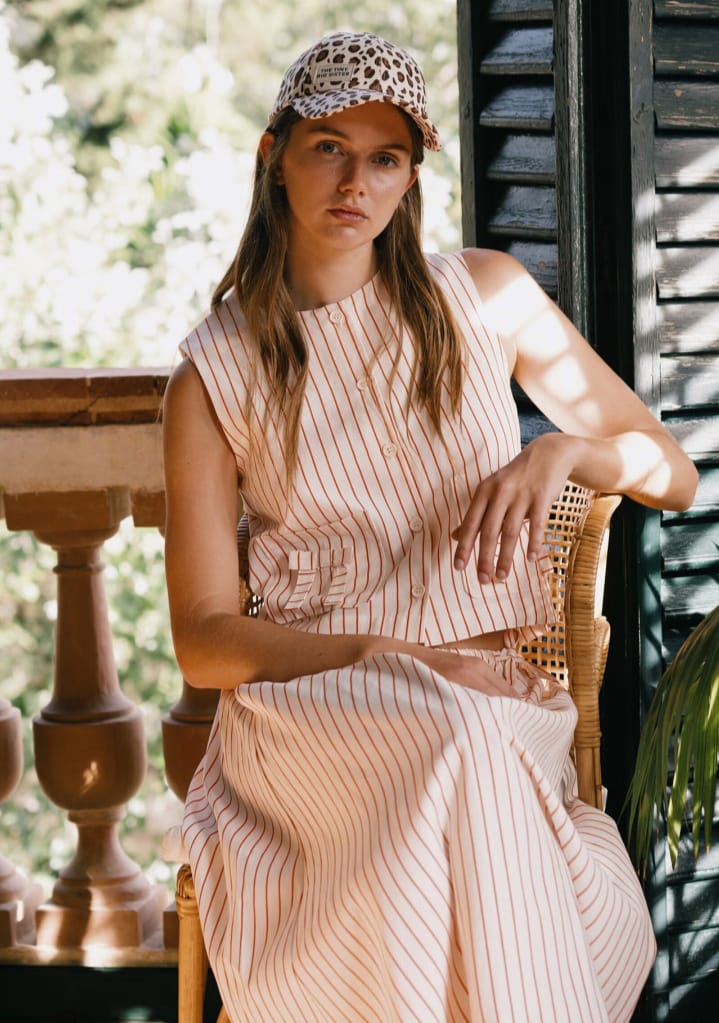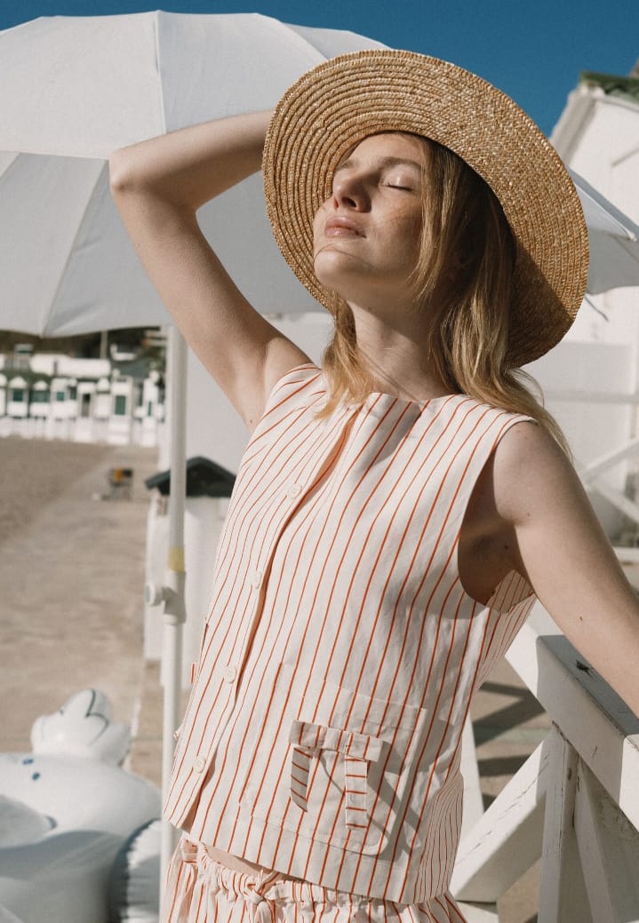 Top sin mangas confeccionado en mezcla de algodón, viscosa y lino, con ligera textura, transpirable y ligero, de caída suave y fluida. De base color blanco roto con estampado de rayas. Presenta una silueta ligeramente cuadrada, bolsillos parche, detalles de lazos y cierre frontal completo con botones. Disponibles pantalones a juego para un look coordinado.