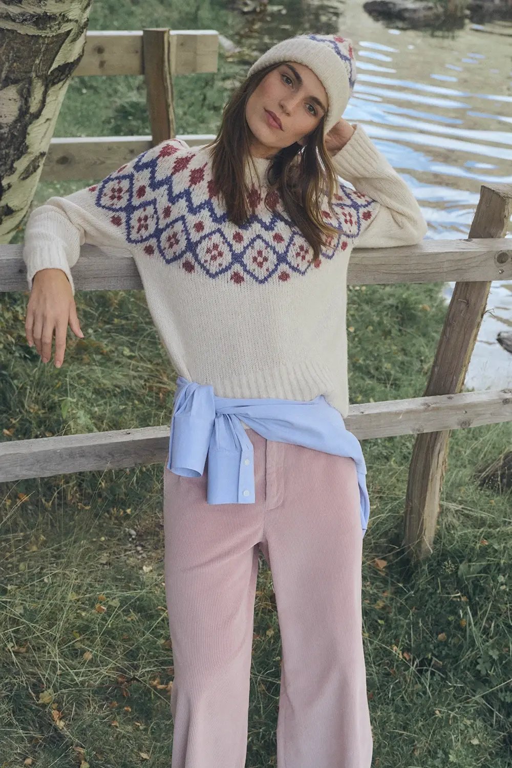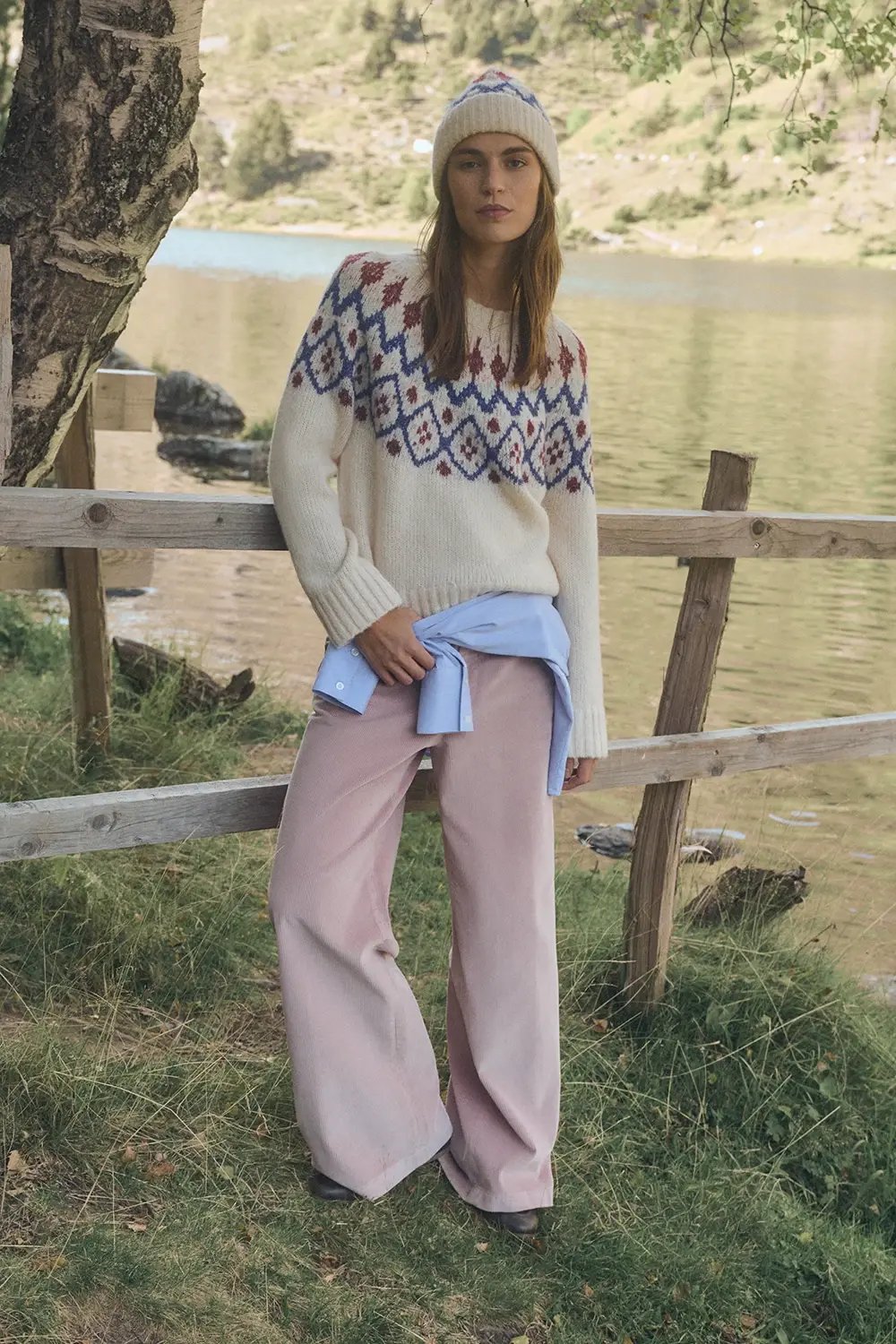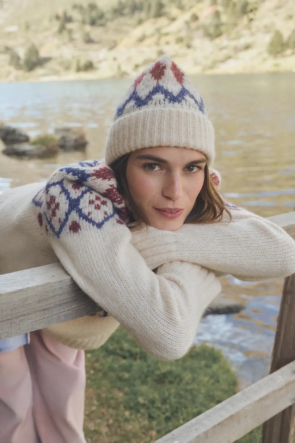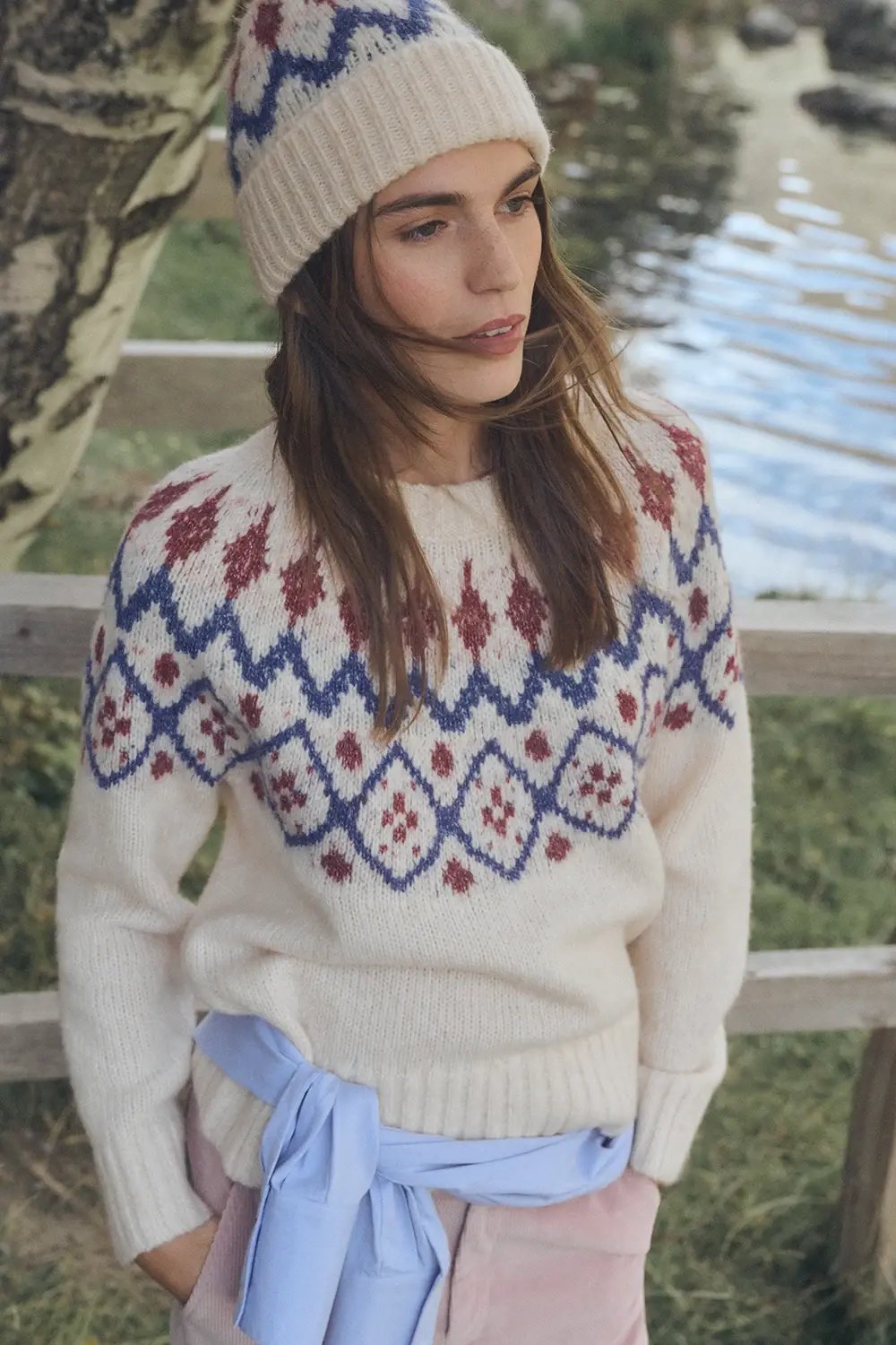 Jersey estampado grecas, cuello redondo, mezcla de lana y alpaca.