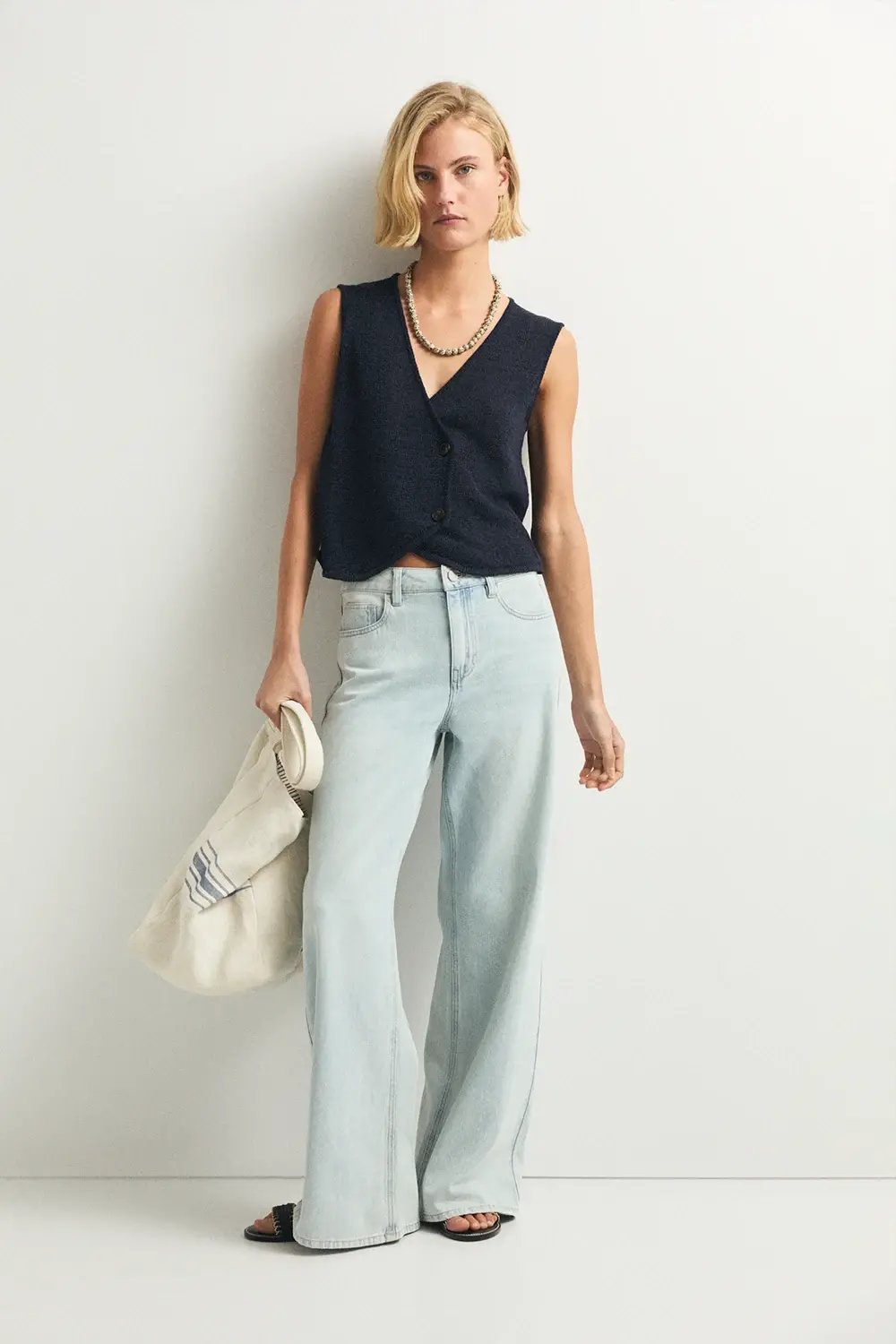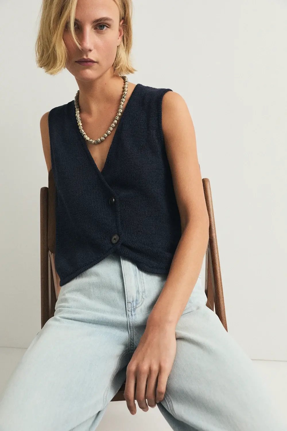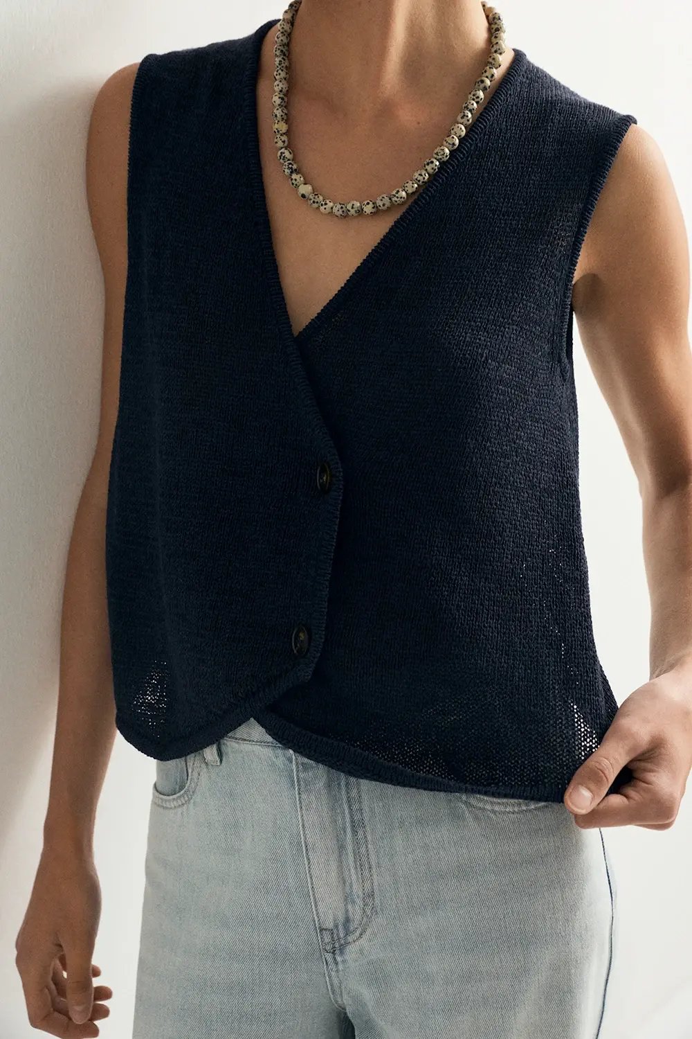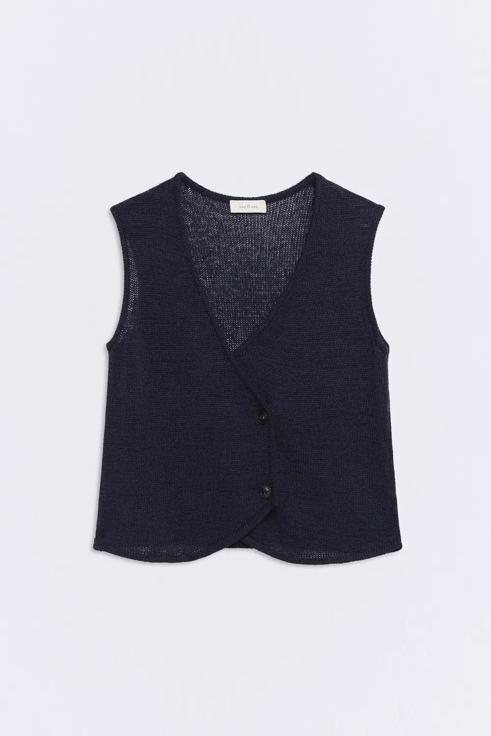 El top Sabbia es una prenda ligera confeccionada en mezcla de lino y algodón, con tejido de punto abierto fino (galga 5), en color azul marino.
