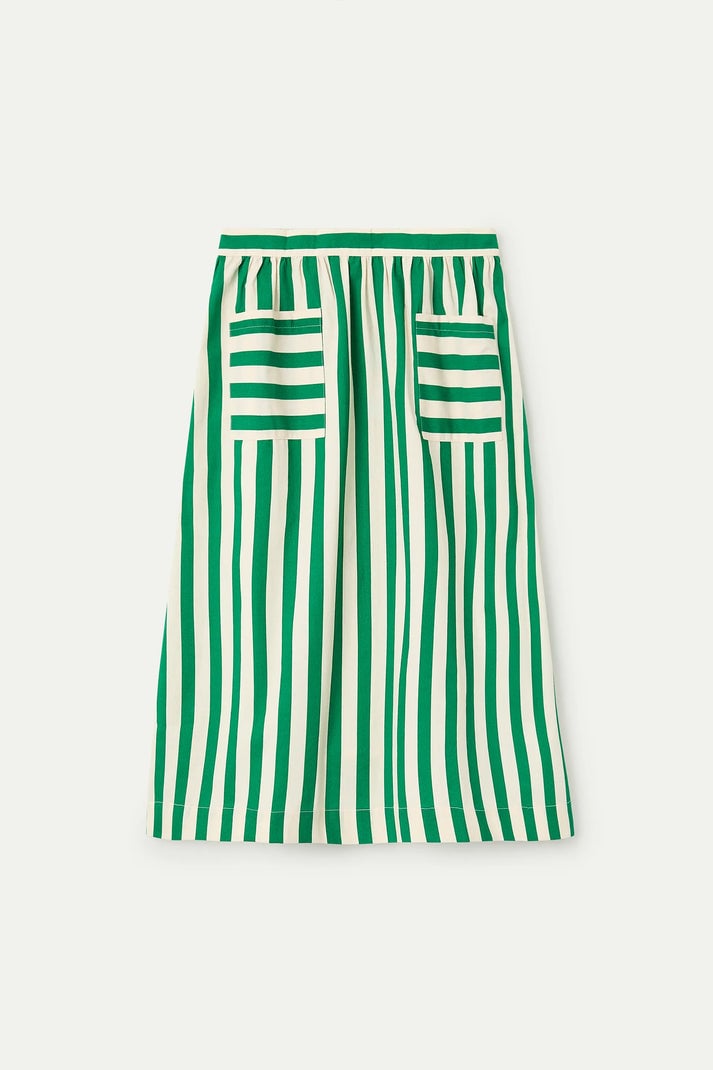 Vestido midi con estampado lavagna green. Cuello con solapa y sin mangas. Cierre frontal con botones de color verde. Cintura elástica. Bolsillos laterales.