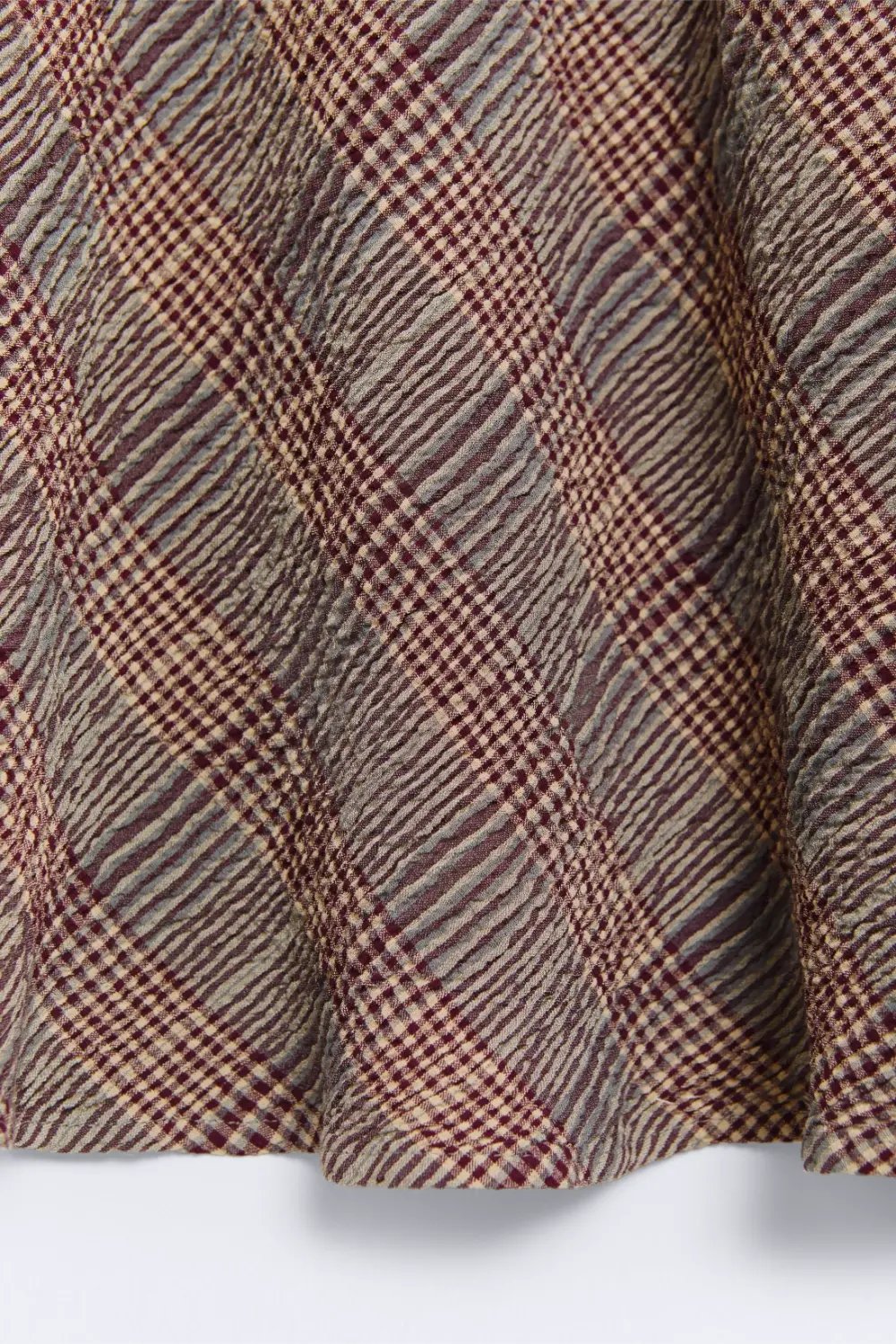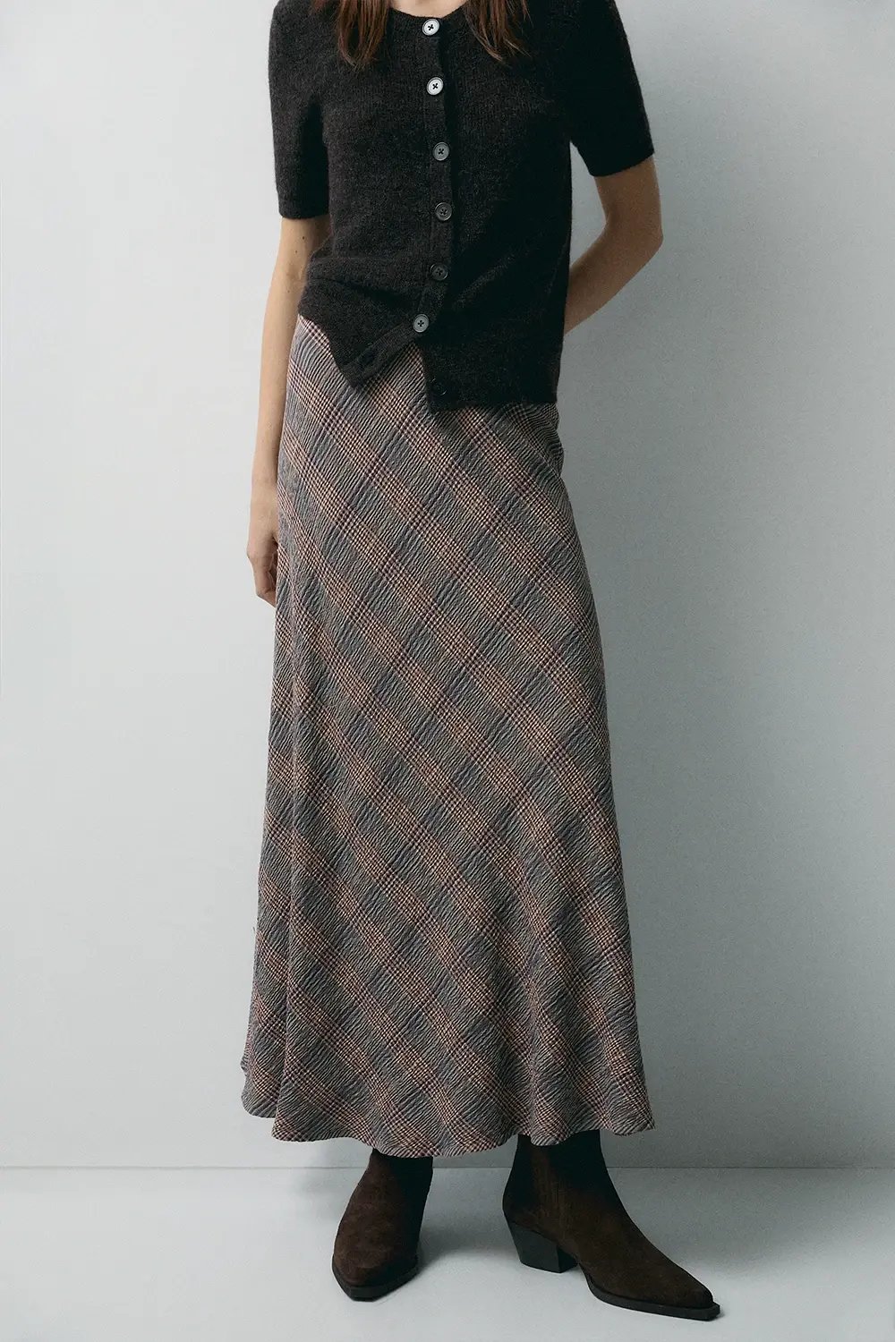 Falda larga con corte al bies. Con estampado de cuadros. Forro interior. Con goma en la cintura.