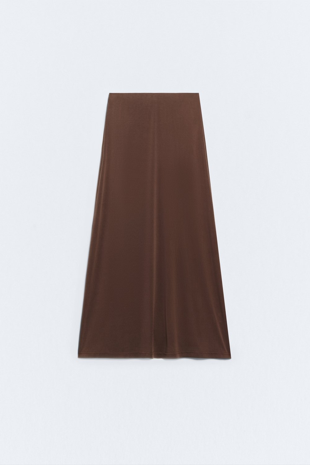 Falda larga fluida. Cinturilla con goma interior. Tejido elástico. Sin cierre. Calidad del tejido tipo cupro. Largo prenda para talla S: 90 cm.