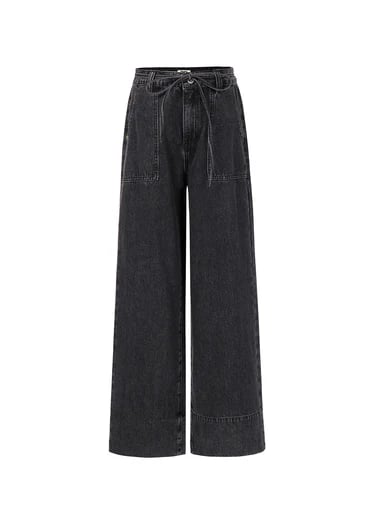 Pantalón denim en algodón, color negro lavado, bolsillos laterales inclinadois y traseros estilo chino, corte holgado.