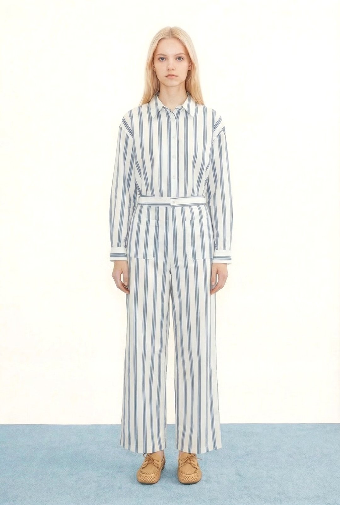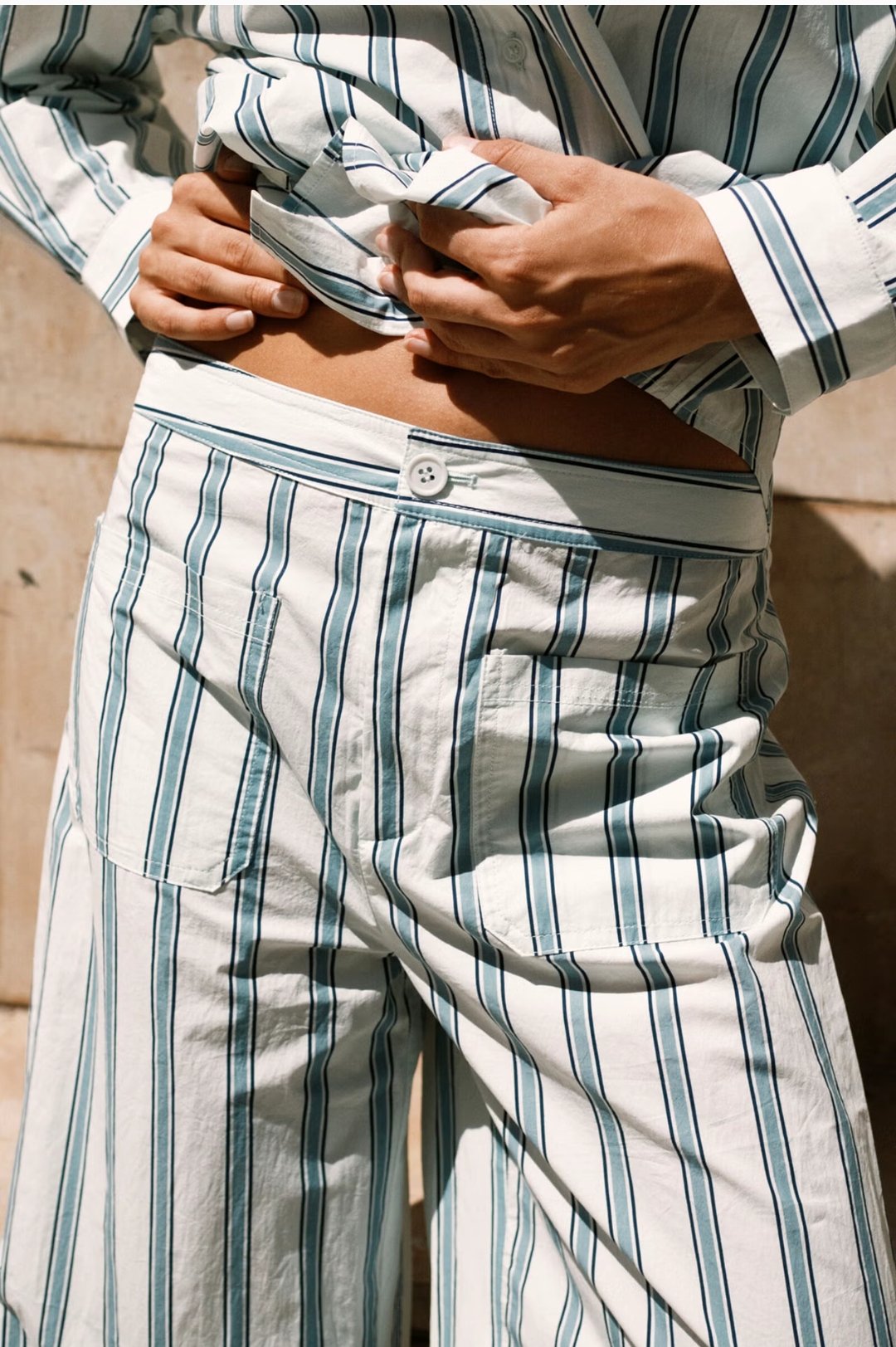 Pantalón en algodón ligero con textura “paper touch”. Base azul claro con raya tejida. Con corte suelto y pierna recta, presenta prácticos bolsillos delanteros y traseros de parche y cierre frontal con cremallera. Disponible con camisa a juego para un look coordinado.