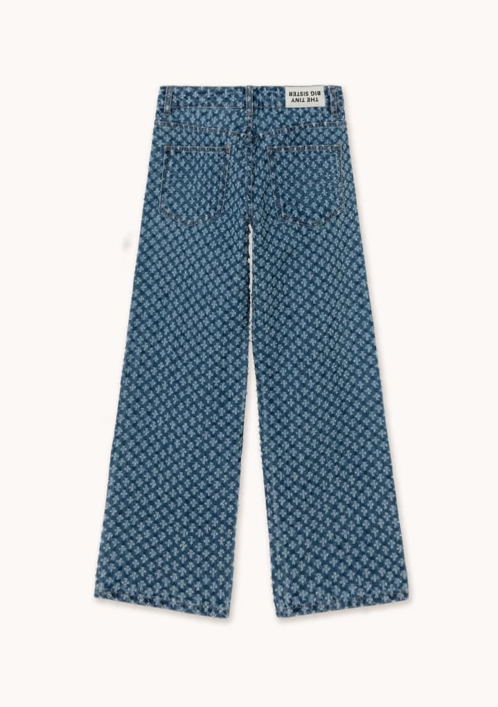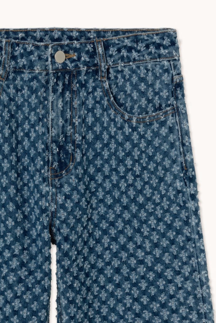 Vaquero Maru en denim con textura perforada y lavado medio. Presenta diseño de cinco bolsillos y cierre frontal con cremallera y botón.