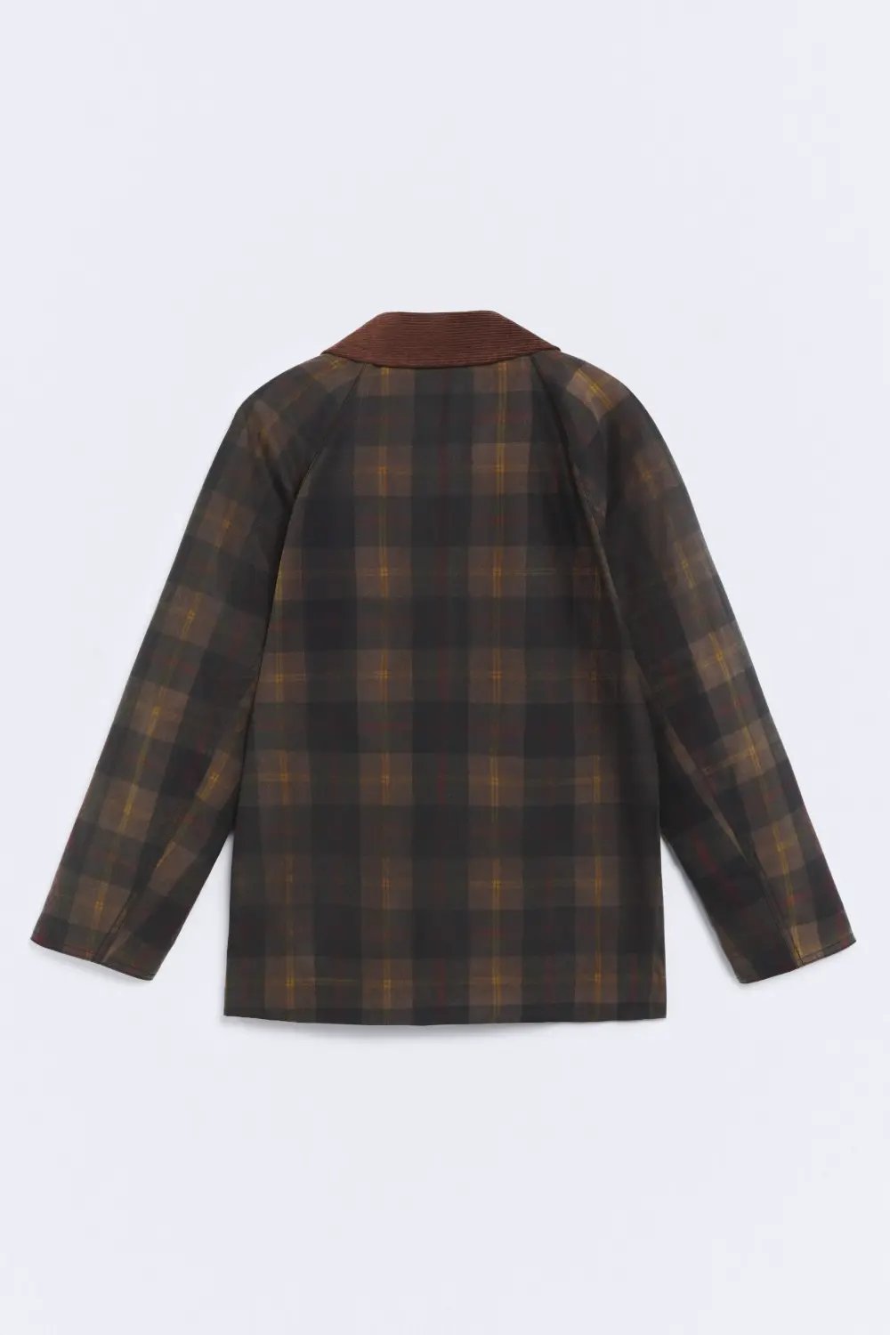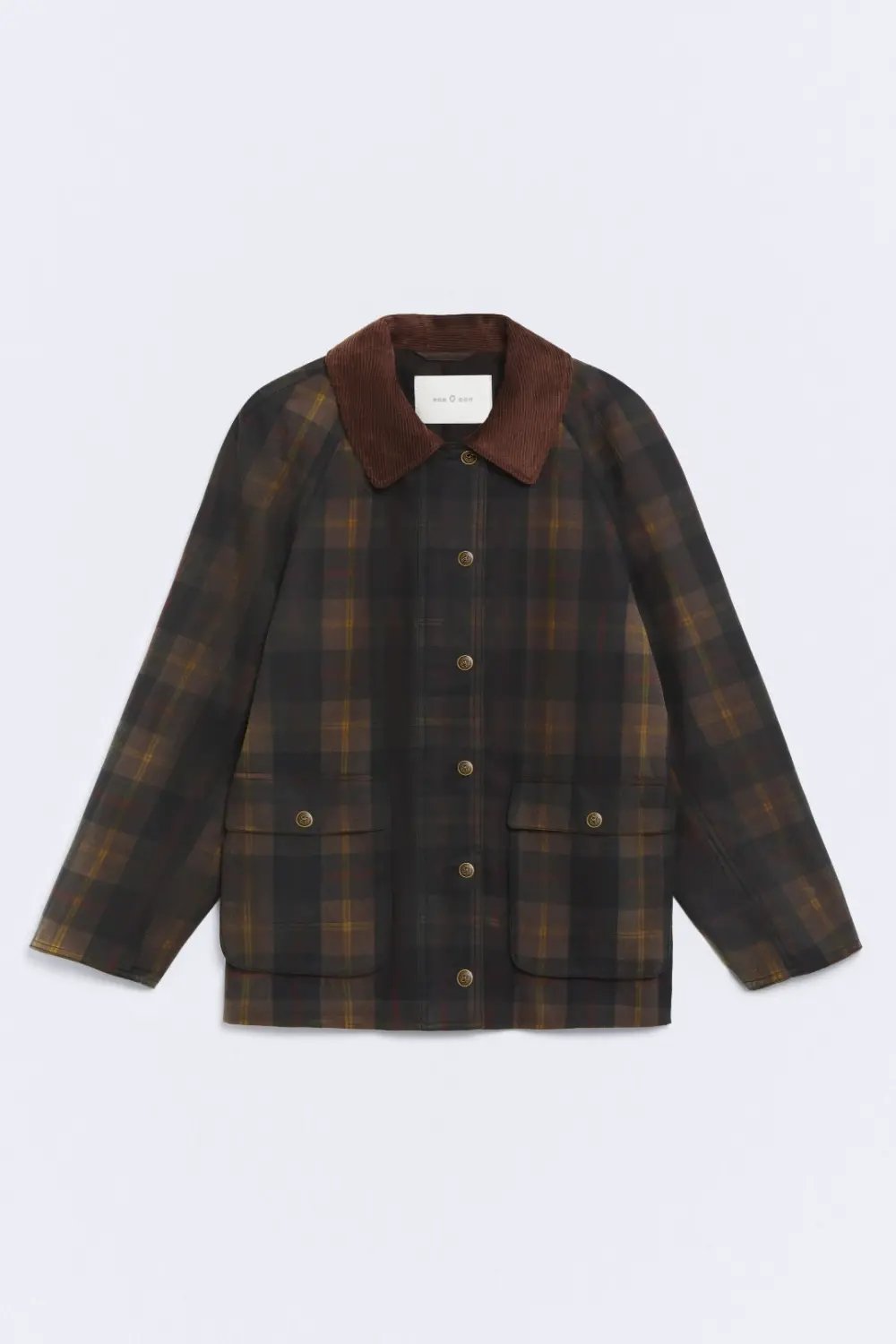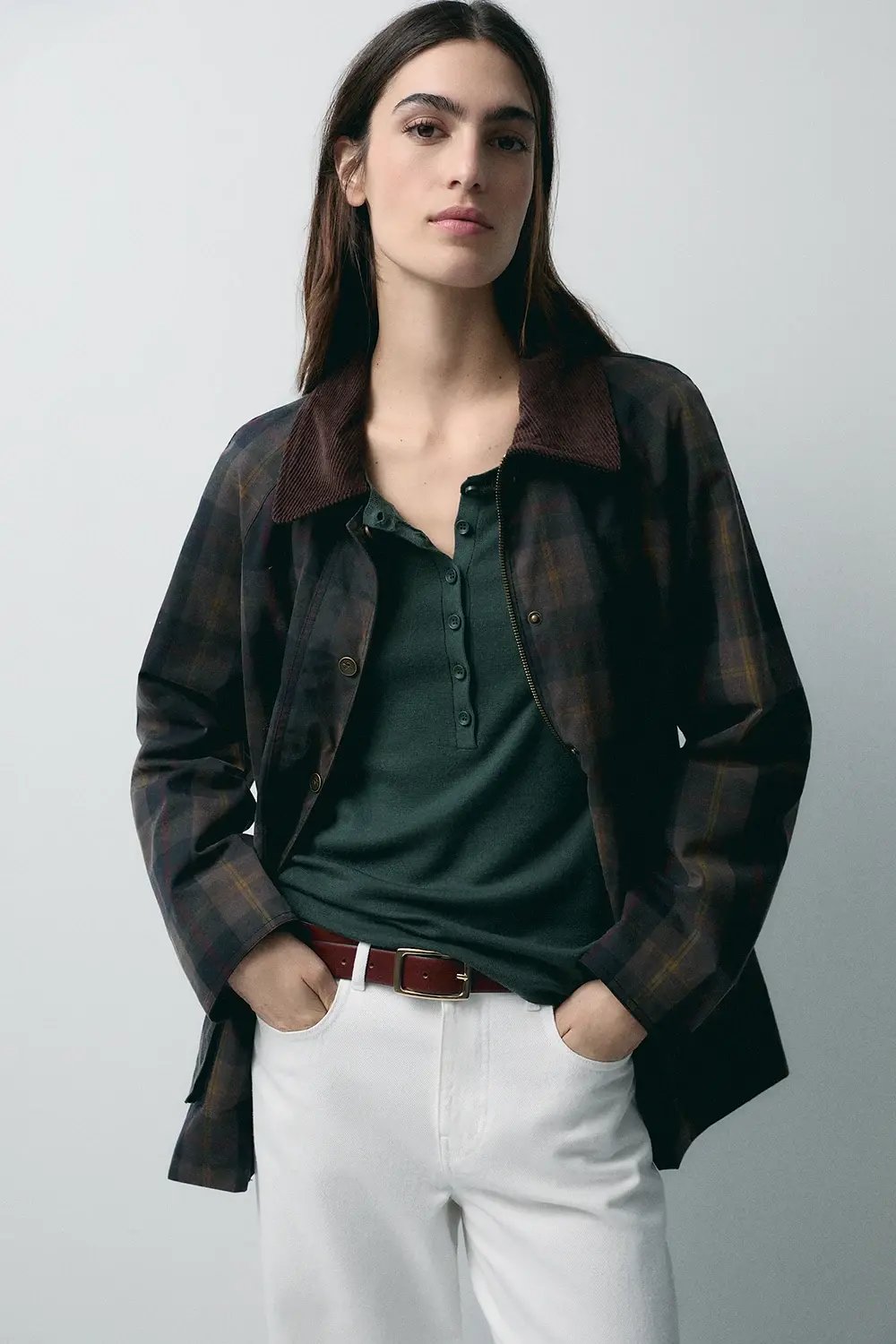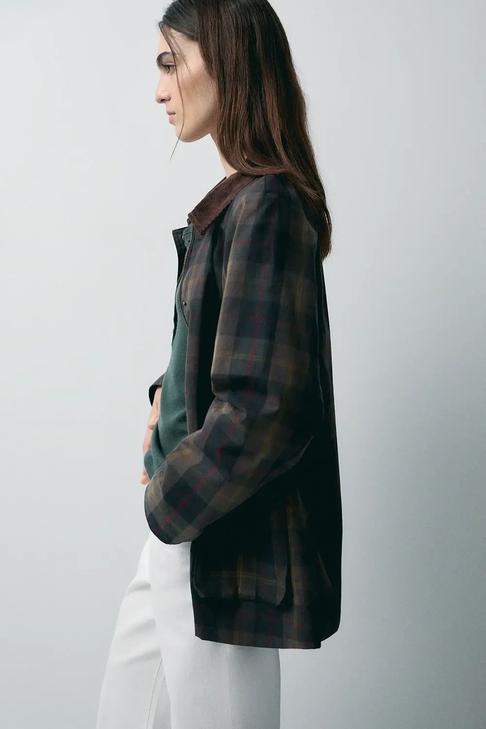 Chaqueta de algodón BCI con cuello de pana a contraste. Cierre con cremallera dorada y botones a presión mate.