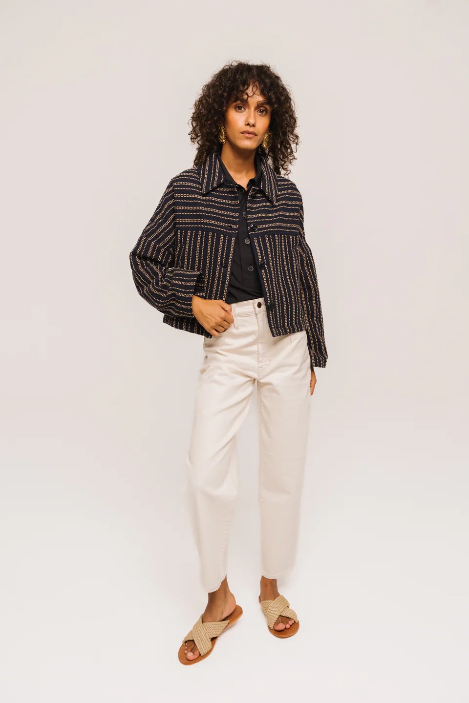 Surchemise crop en mélange de coton à rayures tissées. Emmanchures basses, poches passepoilées et col chemise pour une allure décontractée mais structurée.