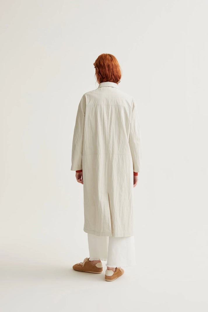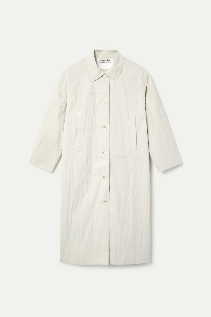 Gabardina con tejido 70% algodón de color blanco roto. Cuello solapa y manga larga. Cierra frontal con botones bicolor. Bolsillos laterales.Forro interior.