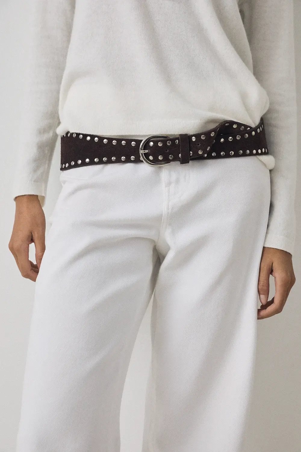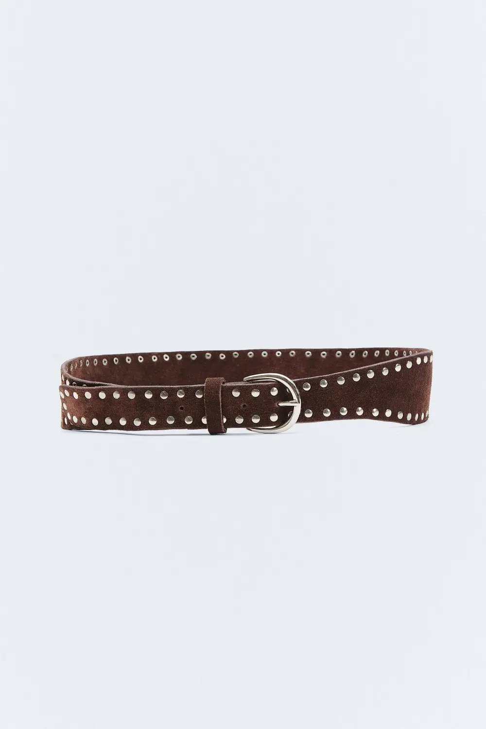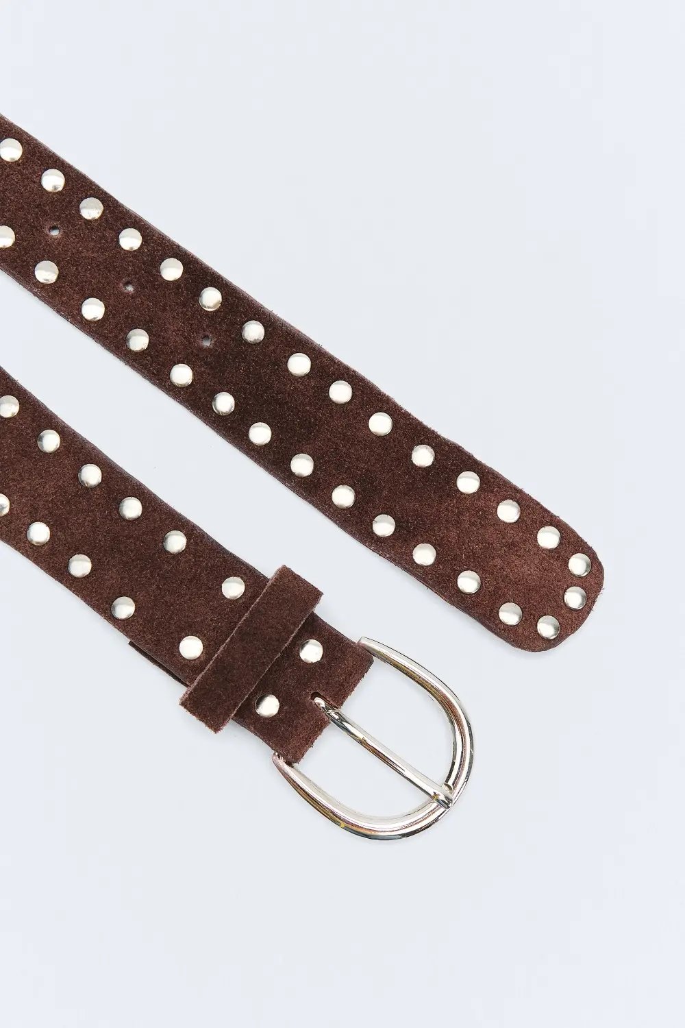 Cinturon de serraje. Con detalle de tachas y hebilla plateada. Interior textil. Ancho de 3,5 cm. Parte trasera con ancho de 6 cm.