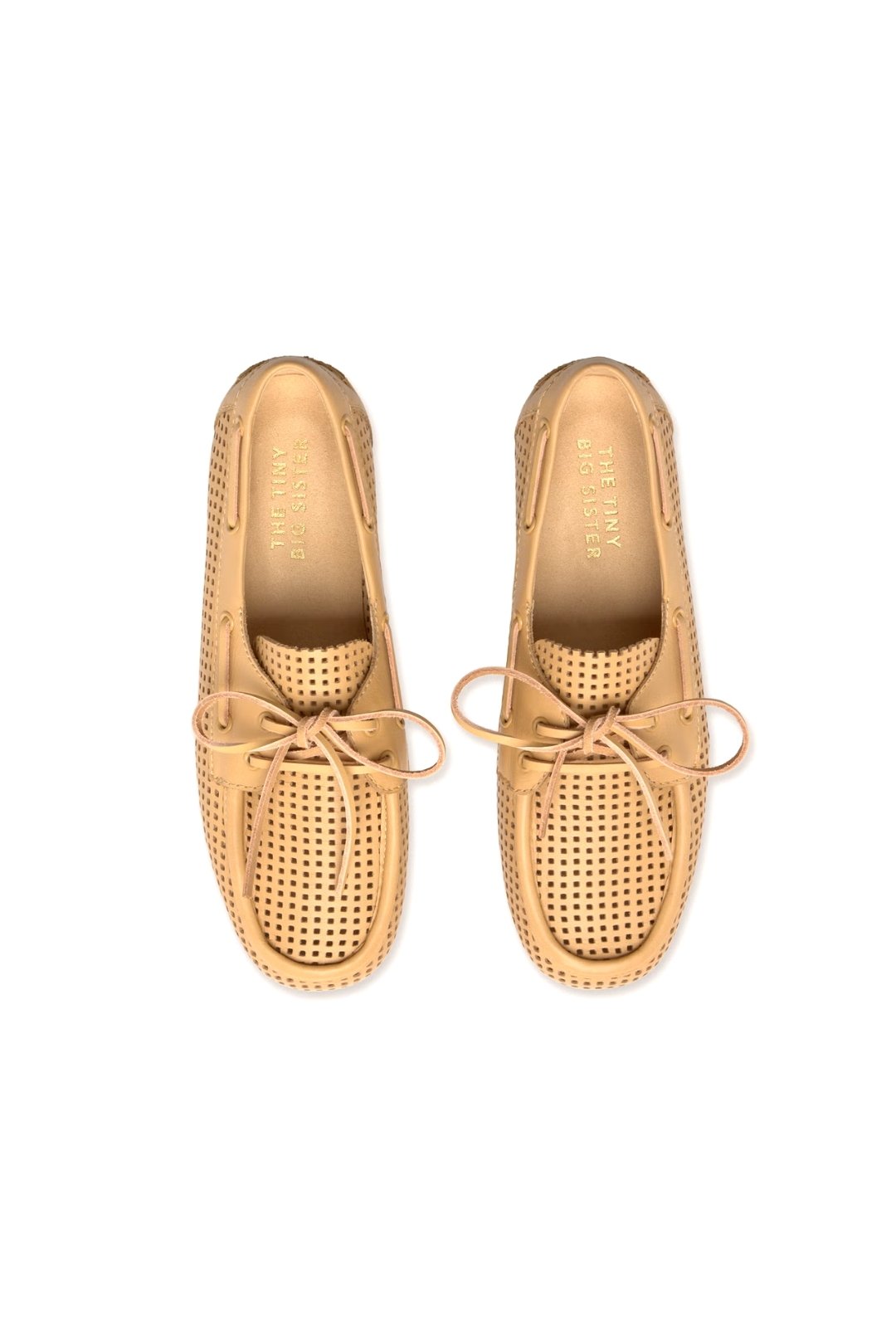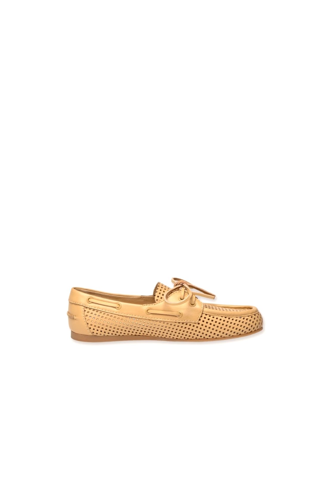 Náuticos en piel perforada, en tono almendra claro, con lengüeta extraíble adornada con flecos, sujeta mediante los cordones, y acabado con un sutil logo dorado.